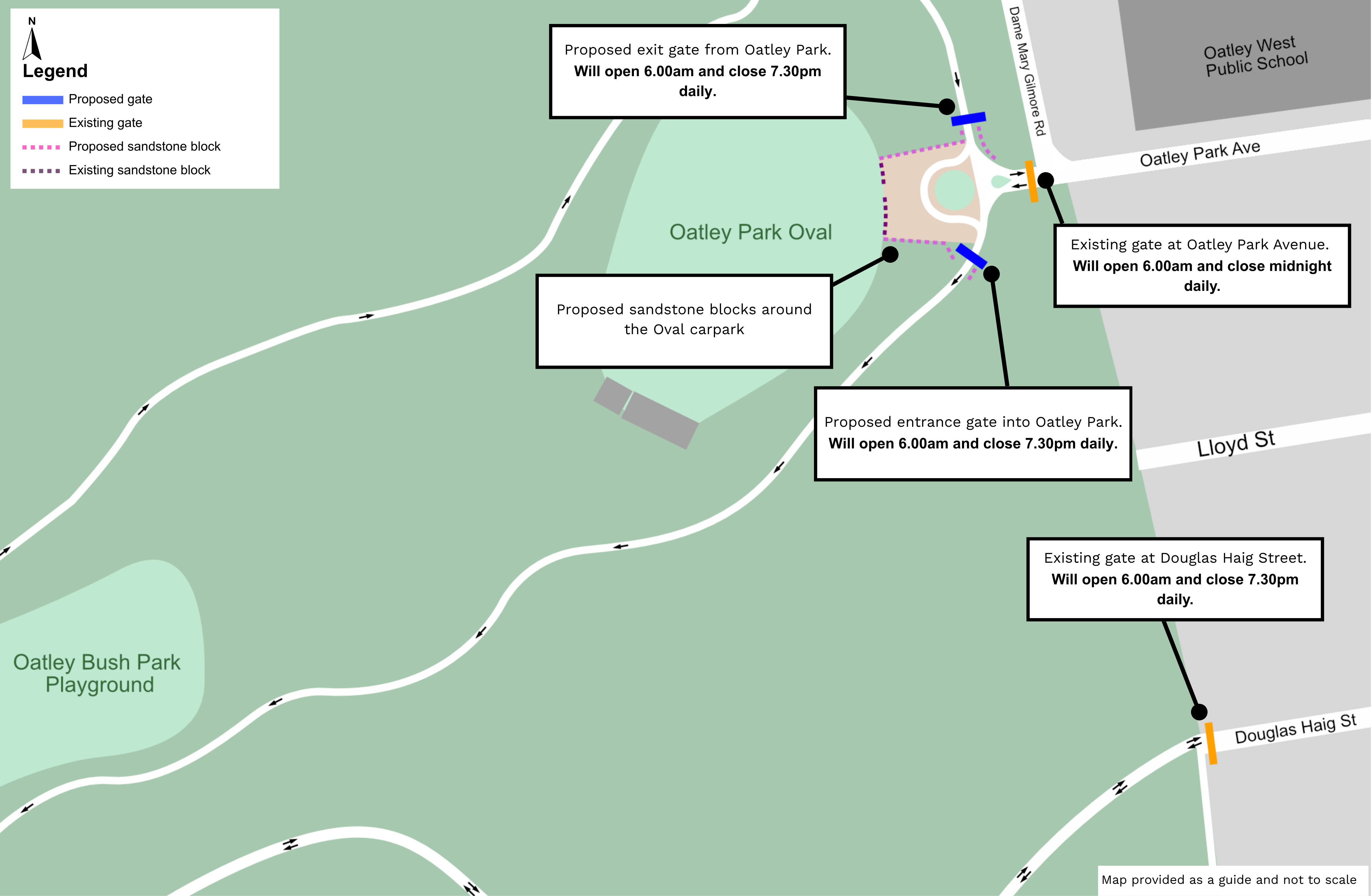 Consultation is now open and will close 24 November. Right now, we are sharing our proposal to install two new gates and sandstone blocks at Oatley Park. We are asking for:
